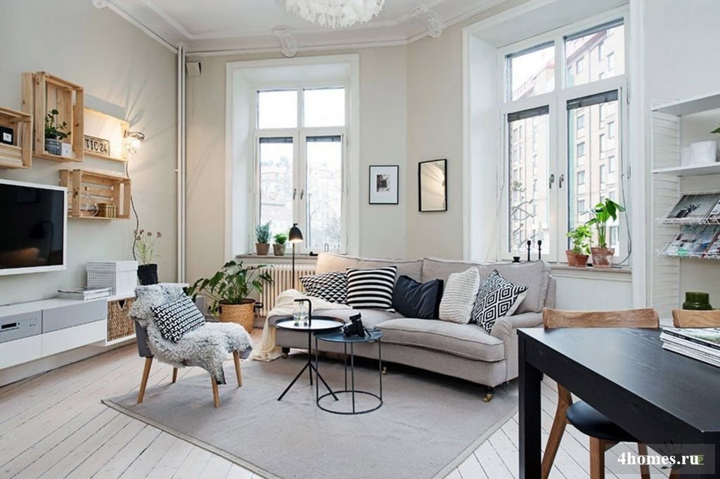 Скандинавский стиль не любит большие кресла и диваны размером с половину комнаты. Если в комнату хочется поставить мягкую мебель, лучше купить маленькие пуфики, которые легко передвигаются по помещению. На пуф удобно ставить ноги, сидя на диване. Если их несколько, можно рассадить вокруг журнального столика довольно большую компанию людей.