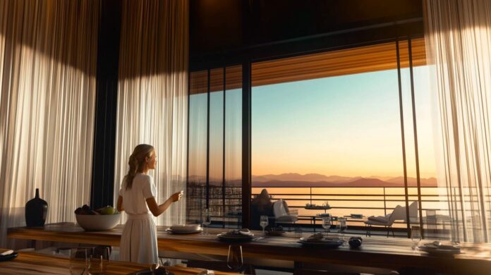 Электрические карнизы идеально подходят для оформления больших оконных проемов, панорамных окон и эркеров, где использование традиционных карнизов может быть затруднительным или неэстетичным. Они позволяют легко управлять тяжелыми и многослойными шторами, создавая эффектные световые сценарии и подчеркивая архитектурные особенности помещения.