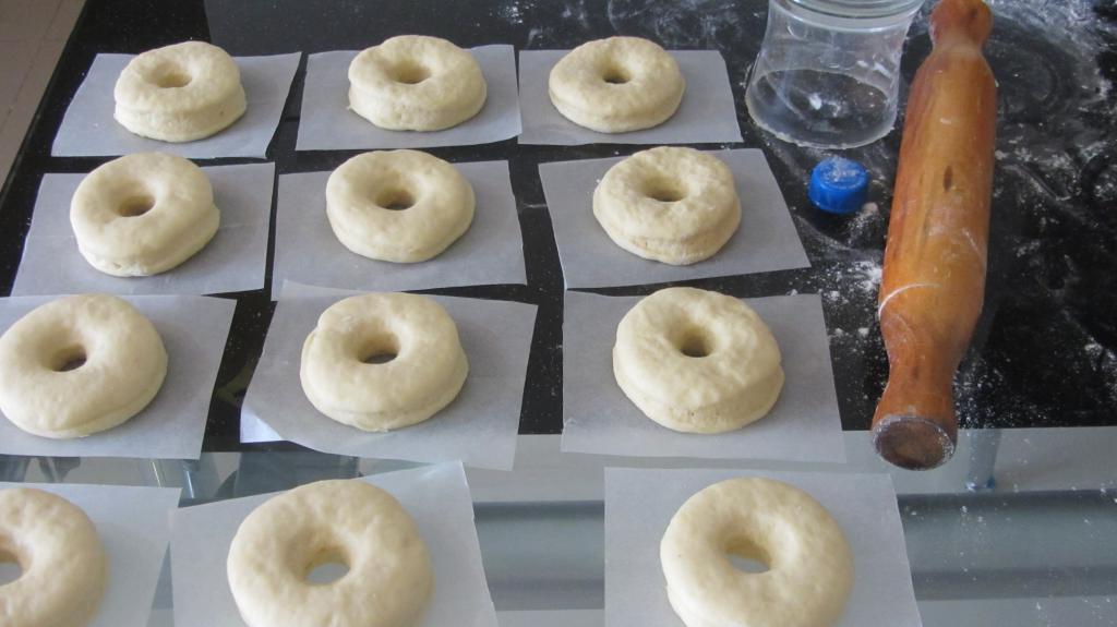 Подошедшее тесто раскатать на столе, главное, не слишком тонко. С помощью формочки кольца или круга вырезать из теста будущие донаты. Равномерно разложить их на противень, неплотно накрыть пищевой пленкой и убрать на сутки в холодильник. Можно ускорить процесс. В принципе, готовые пончики можно подержать в холодильнике всего 30 минут и начинать готовить. Однако, чем больше времени они проведут в холодильнике, тем более пышными и воздушными они станут после обжаривания.