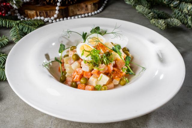 И, конечно, праздничные позиции в меню! Поднять новогоднее настроение тебе помогут «Сельдь под шубой с щучьей икрой» (420 р.), «Стерлядь в шампанском» (3400 р.), «Утиная ножка с пюре из яблок» (1100 р.), «Оливье с семгой и красной икрой» (460 р.) и «Новогодний глинтвейн» (400 р.).