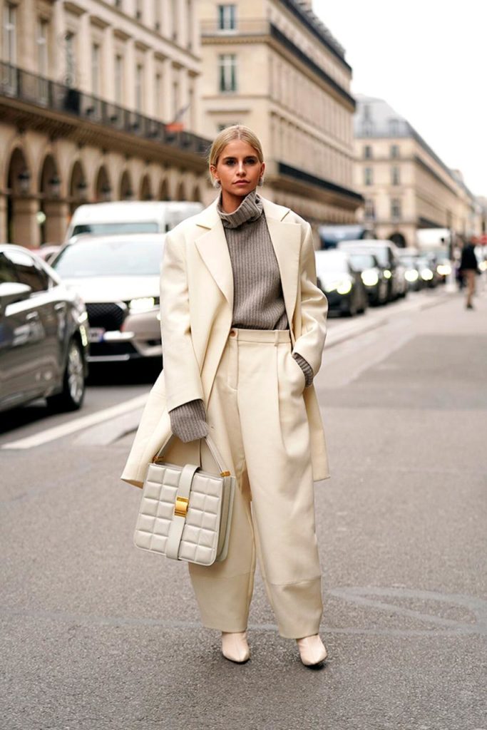 Если в твоем гардеробе есть брючные оверсайз-костюмы, то этот прием тебе точно понравится! Вместо рубашки надевай свободный свитер с высоким горлом. Можно остановиться на пастельных цветах или выбрать яркий розовый свитер, как Хейли Бибер.