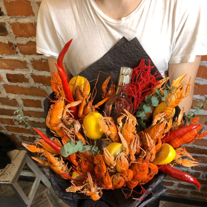 Большинство мужчин обожают раков т креветок, поэтому можно ожидать, что букет из раков и креветок вызовет положительные эмоции. Можно купить как недорогие варианты, так и шикарные композиции, состоящие из большого количества морепродуктов.