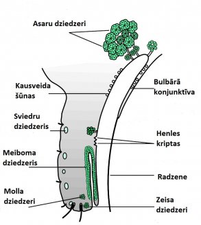 Оба эти заболевания глаз – это воспаление расположенных в веках мейбомиевых желез или сальных желез Цейса, которые протекают либо стремительно и остро, либо пассивно и хронически. Мейбомиевы железы расположены на хрящевой пластине верхнего и нижнего века и на каждом веке их около 25-30 шт. Эти железы в норме медленно производят жир, который защищает глаз от сухости и укрепляет слезоточивую пленку, защищая слезы от преждевременного испарения. Их воспаление происходит в случаях, если их оттоки блокируется из-за механических причин или в результате инфекции.