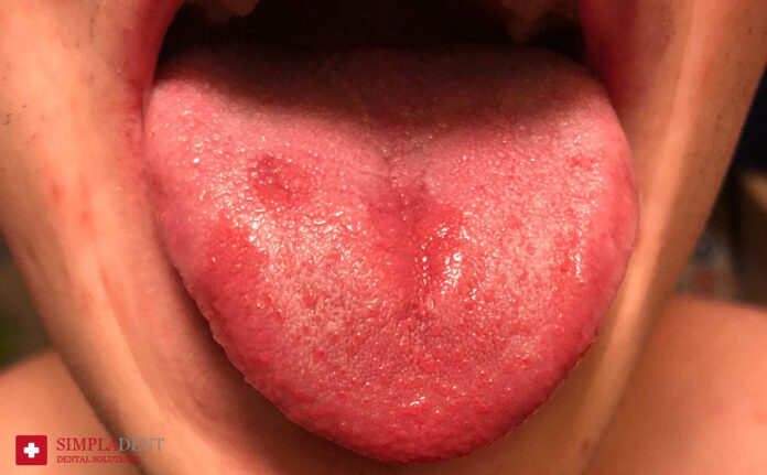 В этом случае, красное пятно в виде ромба или овала появляется на середине языка. Сосочки атрофируются, человек испытывает боль при пальпации. Во время еды пощипывание и жжение усиливаются. Болезненное красное пятно во рту доставляет дискомфорт во время разговора.