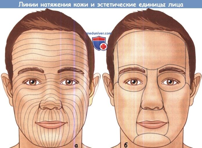 а) Терминология. Обсуждение данной темы требует понимания основной терминологии, касающейся описания ран. Линии натяжения кожи лица представляют собой линейное расположение, определяемое степенью натяжения. Они имеют линейный или закругленный ход, идут параллельно мимическим мышцам, расположенным под подкожными тканями. Линии максимального растяжения кожи идут перпендикулярно линиями натяжения.