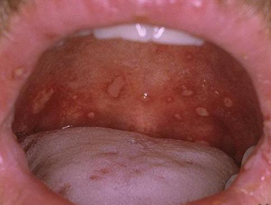 Отличительным признаком болезни являются пузырьки небольшого размера, появляющиеся группами на губах, нёбе, языке. Слизистая полости рта приобретает ярко-красный оттенок. Пузырьки заполнены прозрачной жидкостью, которая постепенно мутнеет. Примерно через 3 дня пузырьки лопаются, оставив после себя эрозии, покрывающиеся фибринозным налетом желтого или белого цвета.